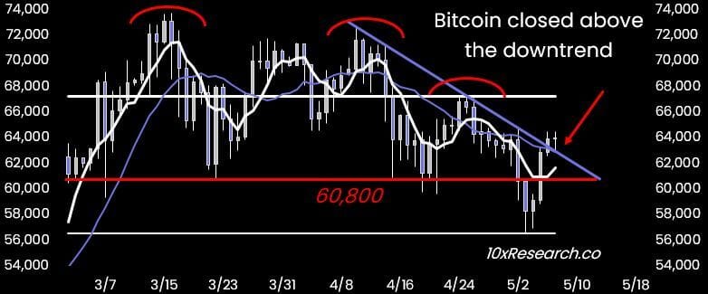 👇5-12) 現在の(中立的な)市場状況にもかかわらず、ビットコインは米国の選挙サイクルと継続的な赤字支出によって支えられている。これが、5月3日の10x Researchレポートで私たちが「Line In the Sand(譲れない一線)」を68,300から62,000に調整した理由である。市場は62,000以上で、強気で取引される可能性がある。実際の「Line In the Sand(譲れない一線)」は60,800だが、余裕をもたせて設定し、新しいロングポジションに対しては60,800をストップレベルとした。