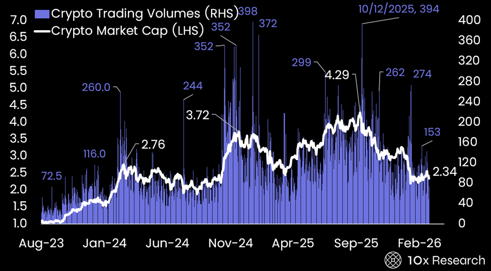 Crypto Market Cap (LHS, $trn) vs. Crypto Trading Volumes (RHS, $bn)