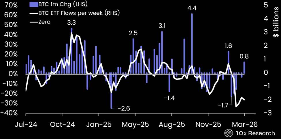 Bitcoin (1m change, LHS) vs. BTC ETF Weekly Flows (RHS, $ billions)