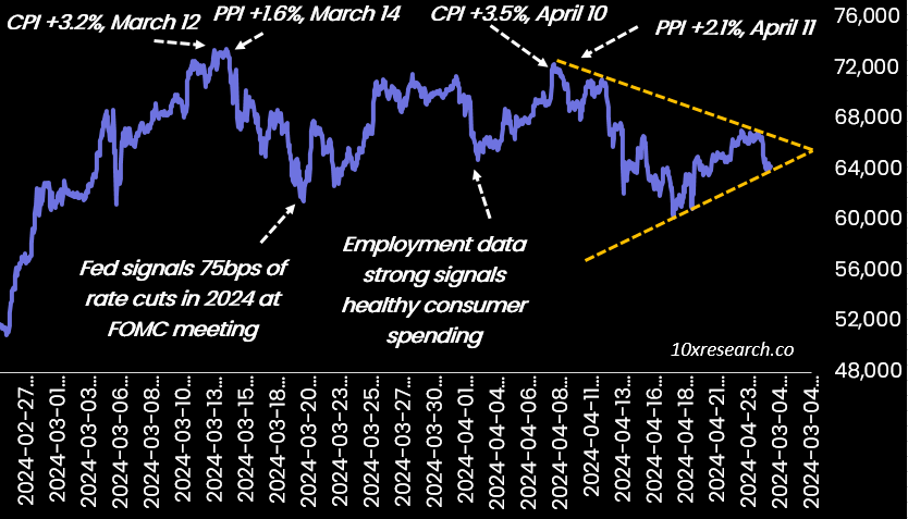 👇7-9) しかし、マクロ経済はビットコインにとって最大のリスクのままである。ビットコインのピークは、CPIとPPIのデータポイントが強化されたときに起こった - それは3月と4月の両方でのことであり - リバウンドは、中央銀行総裁パウエルが、中央銀行家たちがまだ3回の利下げを予想していることを示唆した3月20日に始まった。