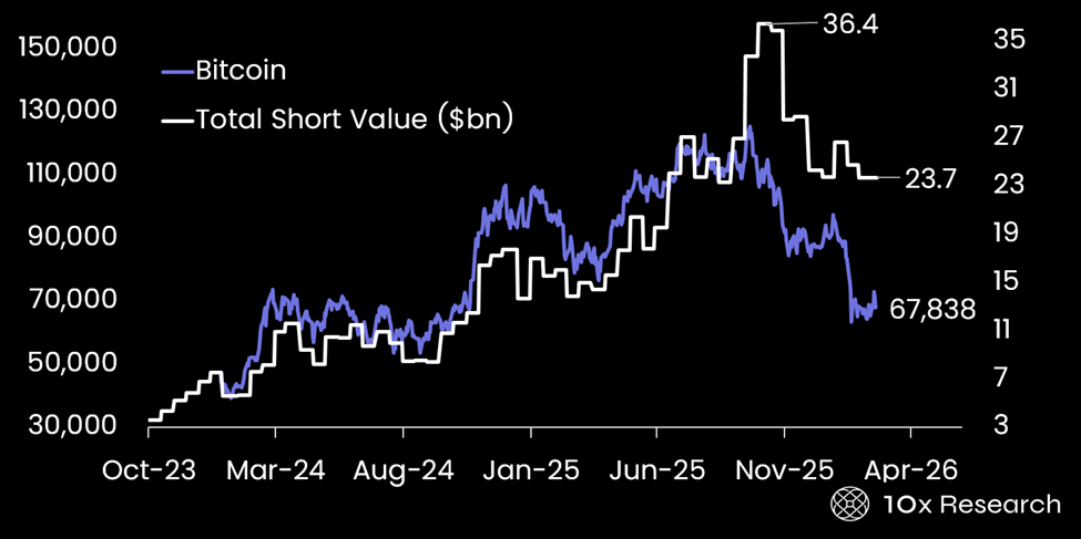 Bitcoin (LHS) vs. value of short positions against crypto equities (RHS, $bn)