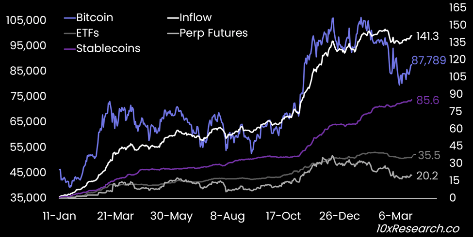 Bitcoin (LHS) vs. Money Inflows Indicators (RHS, $ billions)