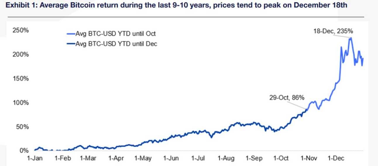 During the last 9-10 years, the average return has been ~+200% for Bitcoin with prices rising +86% by the end of October only then to see an acceleration into year-end. This year could prove to be quite similar to the historical average.