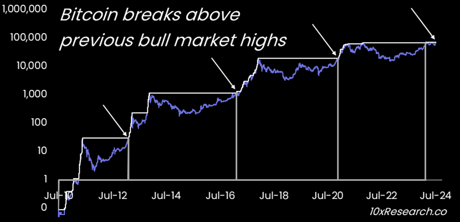 Bitcoin tended to rise parabolically once above previous all-time highs.