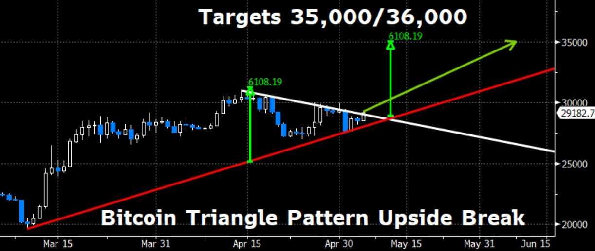 π© In 10 bullet points.π 1)Β Bitcoin prices have been trading in a narrowing triangle about to be broken to the upside. Technically, this could project a move higher by an equal amount when the triangle started to be formed β a range roughly the equivalent of 6,100 points.π 2)Β This could lead to a 6,100-point move higher in Bitcoin prices and set a target of 35,000/36,000 - roughly +20% higher from here.