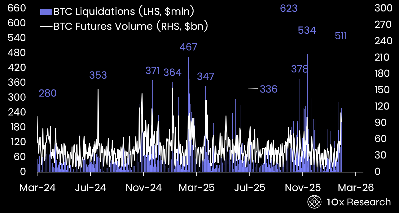 BTC liquidations (LHS, $ millions) vs. BTC Futures Volume (RHS, $ billions)