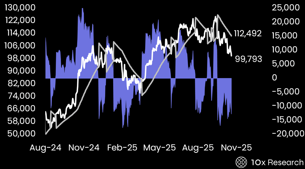 Since October 10, both our Ethereum and Bitcoin trend models have been firmly bearish, and that signal remains intact. While trend systems can incur small losses when markets snap back quickly, they consistently generate strong returns over time because major crypto assets move in extended, high-volatility cycles. This is especially true when positioning pressures or macro catalysts are involved. Over the past few weeks, we’ve had both, which is why we repeatedly warned that this week’s rebound would fade quickly and that a revisit to the $98,000–$100,000 zone was likely (here). What is next? We explain below: