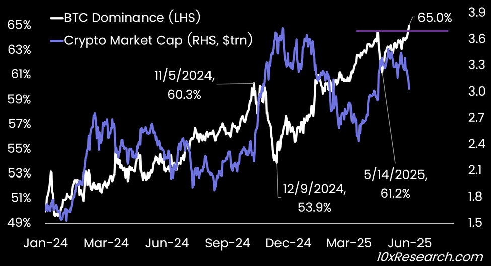Bitcoin Dominance (LHS, %) vs. Crypto Market Cap (RHS, $ trillions)