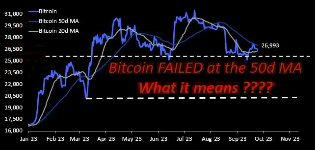 π 1) Bitcoin price is 26,525 below the 50d MA 26,993 -> this is bearish, Ethereum price is 1,589 below the 50d MA 1,683 -> this is bearish. Overall, the trend is down and stays bearish. Bitcoin attempted to break its 50d MA (BUT FAILED, this could open the door for more downside). October tends to be seasonal bullish for Bitcoin but without a break above its 50d MA, we would stay cautious.