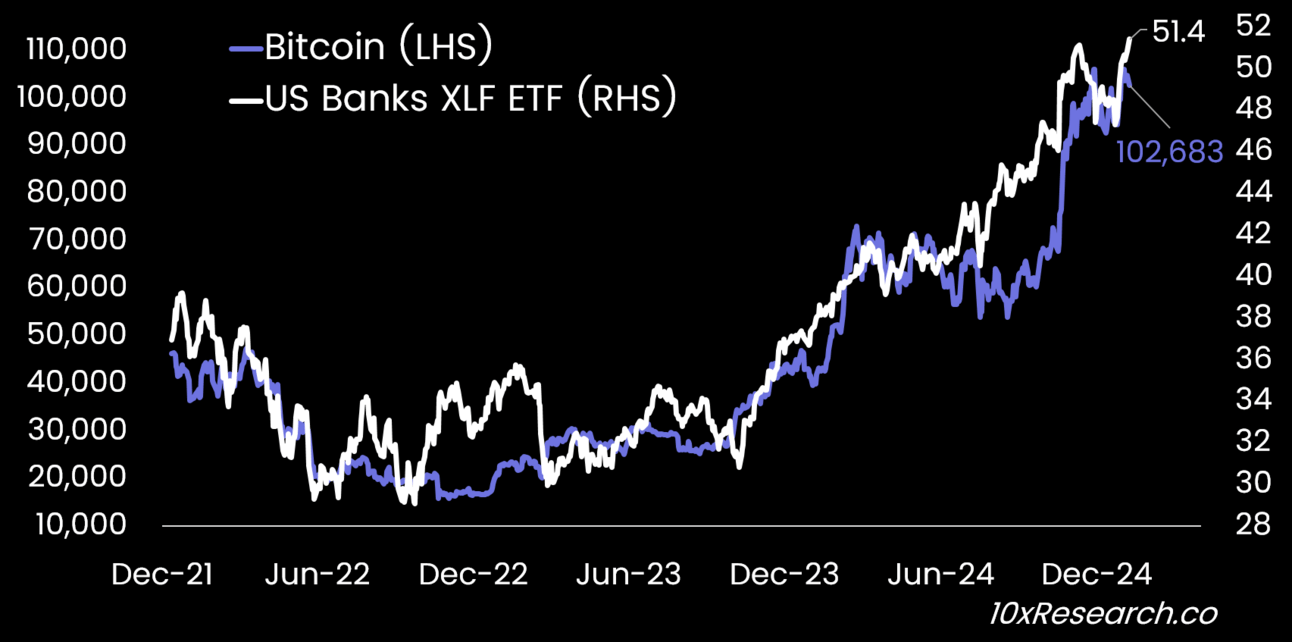 Bitcoin (LHS) vs. US Banks XLF ETF (RHS)