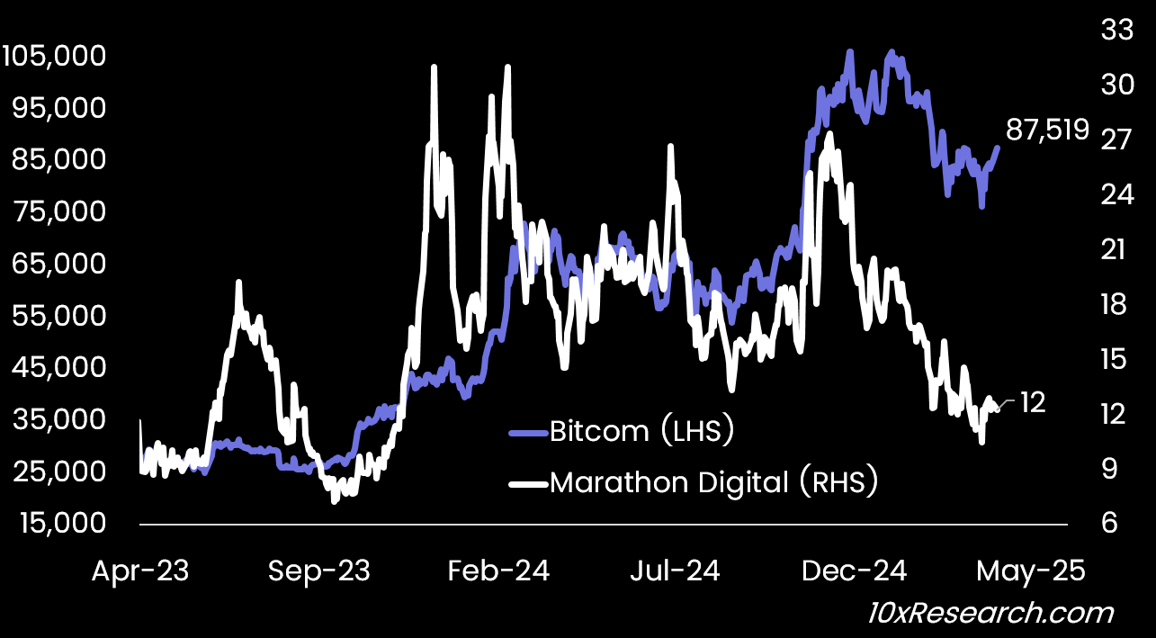 Bitcoin (LHS) vs. Marathon Digital (RHS)