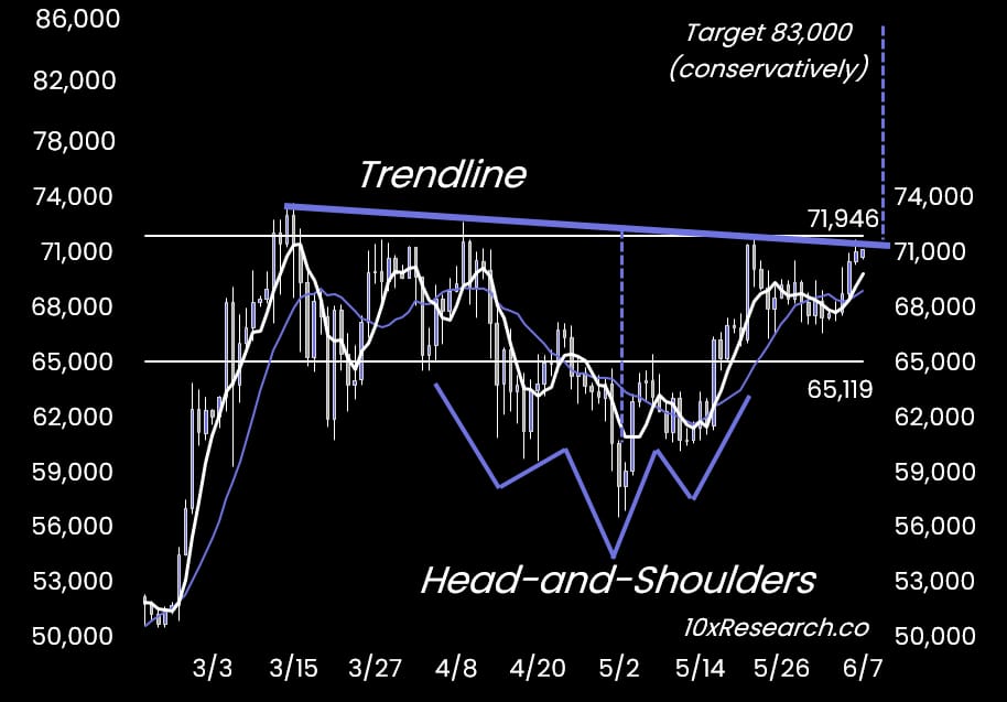 👇1-11) It is only a matter of time until Bitcoin makes a new all-time high. The head-and-shoulders formation suggests a rally towards 83,000 soon, with the resistance line likely broken within the next few days. The ideal time for this resistance to break is either today, Friday, June 7, or next week, Wednesday, June 12.