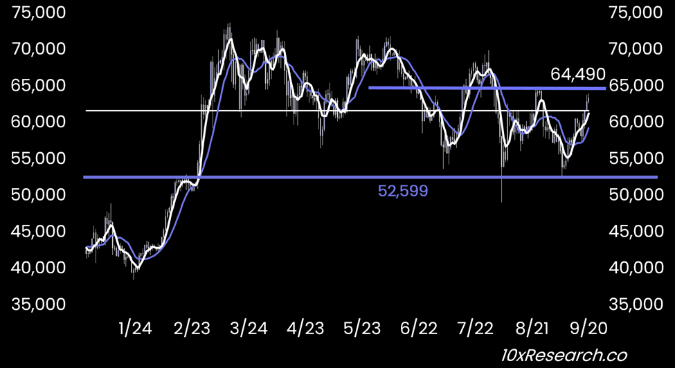 👇3-14) We also noted that a breakout above Bitcoin's descending trend line could signal stronger upward momentum, potentially allowing Bitcoin to surpass the 21-week simple moving average ($60,996), a key indicator of whether it is in a bull (above) or bear market (below). As we outlined, a break above this level would target $65,000 (now within reach).