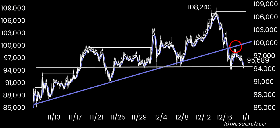 👇1-10) Despite a weaker PCE inflation report and attempts by two Federal Reserve members to calm financial markets following Chair Powell’s hawkish press conference, Bitcoin (and the broader crypto market) remains under pressure. The uptrend line (purple) has been broken, and while prices initially fell toward our $92,000/$93,000 support zone, the subsequent rebound was short-lived, stalling as Bitcoin hit the now-resistance purple trendline (red circle).