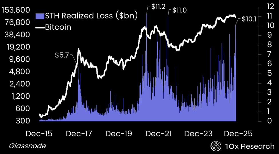 Bitcoin (LHS) vs. Realized Loss by Short-Term Holders (RHS, 1 day, $ billions)