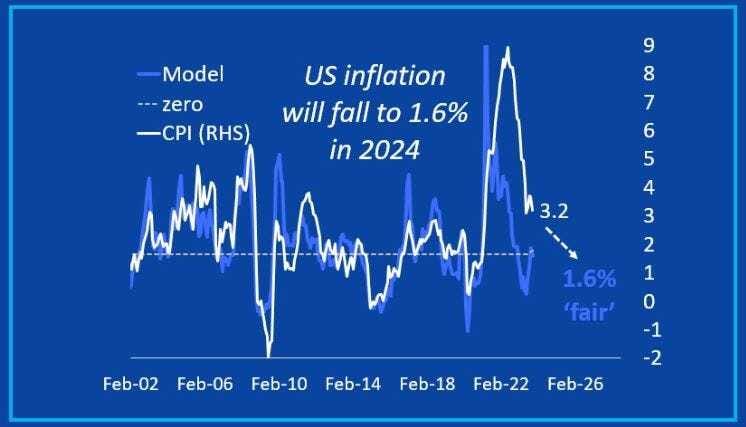 Summary: According to last nightβs inflation data, the US CPI declined below expectations from 3.7% to 3.2%, and according to the model, US inflation could fall to 1.6% in 2024. The result would be an ongoing rally in risk-on assets β such as tech stocks and crypto. But despite our bullishness, there was some near-term risk, and we are not surprised that Bitcoin sold off after last nightβs bullish inflation number. The US House of Representatives has just passed the stopgap bill β which secures funding for the government into the New Year.
