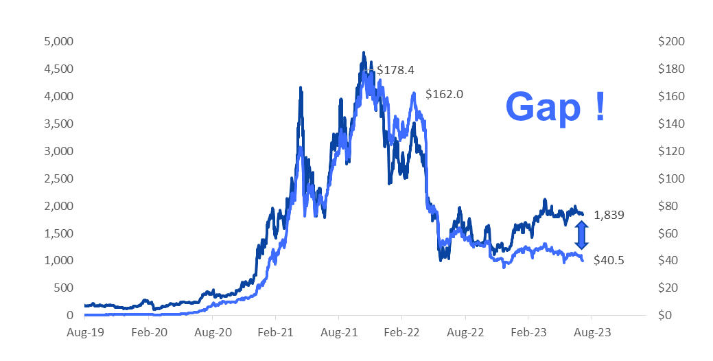 π 2)Β While we are not predicting such a decline, investors should carefully guard their positions and capital. They should take advantage of the cheap convexity that the low option prices currently offer investors.π 3)Β Trading is all about attractive risk-reward opportunities, and the calmness that keeps Bitcoin pinned at $29,000 will not last long. With the US 10yr Yield climbing back above 4.0%, this could cause Bitcoin to decline. But we are mainly concerned about weakening crypto fundamentals.π 4)Β The latest data indicated that TVL dropped back to $40.5bn for the DeFi industry, notably driven by the exploitation of the Curve Finance protocol a few days ago. TVL has been weakening since April (Curve, PancakeSwap, MakerDao all lost billion+ in TVL this year).π 5)Β As a reference point and because Ethereum has been closely correlated to TVL data, Ether prices traded at $1,200 at the beginning of the year and are +53% higher, arguably without improving TVL or other fundamental data points.π 6)Β Transaction revenues and fees have also underperformed this year as DeFi usage has declined without the attractiveness of competitive yields to traditional financial markets that DeFi offered.π 7)Β NFT minting is nearly nonexistent. Etherβs fair value appears closer to $1,000 or -46% lower than current prices ($1,839) when comparing Ether prices to the transaction revenues of the Ethereum network.π 8)Β Hence, we continue to express a slightly more cautious view for the remaining weeks of the summer and expect another strategic buying opportunity to present itself, potentially in September.π 9)Β Traders could use the collapse in implied volatility and buy cheap optionality - either calls or puts, as it is just a matter of time before crypto prices move.π 10)Β The Bollinger Bands, a signal that measures the range of prices and how far prices are overbought/oversold from the moving average, indicates that a significant move could occur at any moment.π 11)Β Our Greed & Fear index continues to trade lower, signalling that Bitcoin prices (and Ethereum) could continue to decline. We prefer to see Bitcoin (and Ethereum) higher towards the end of the year, but we are entering a challenging period where investors must protect their capital.π 12)Β This is not the time to be complacent.π©Learn about the 2020/21 DeFi bull market and the 2022 Crypto bankruptcies in "Crypto Titans: How trillions were made and billions lost in the cryptocurrency markets". Available on Amazon (and other places): (https://amzn.to/3K14sLH)Chart: Ether price (left) vs. TVL (right, $bn)