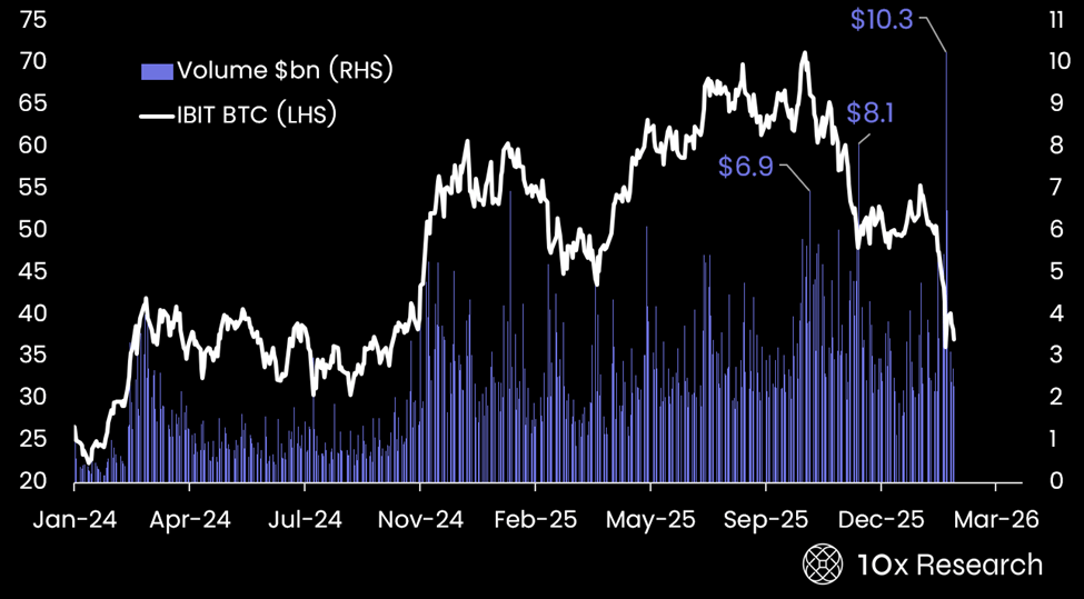 During Bitcoin corrections, trading activity in BlackRock’s IBIT Bitcoin ETF tends to surge, with volumes expanding significantly as institutional positioning adjusts. During the most recent selloff, daily trading volume exceeded $10 billion, underscoring the scale of institutional capital's active repositioning.