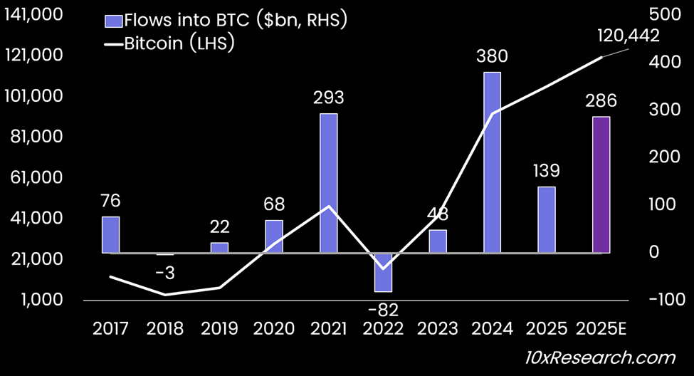 Annual Inflows into Bitcoin ($ billions) and 2025 year-end projection
