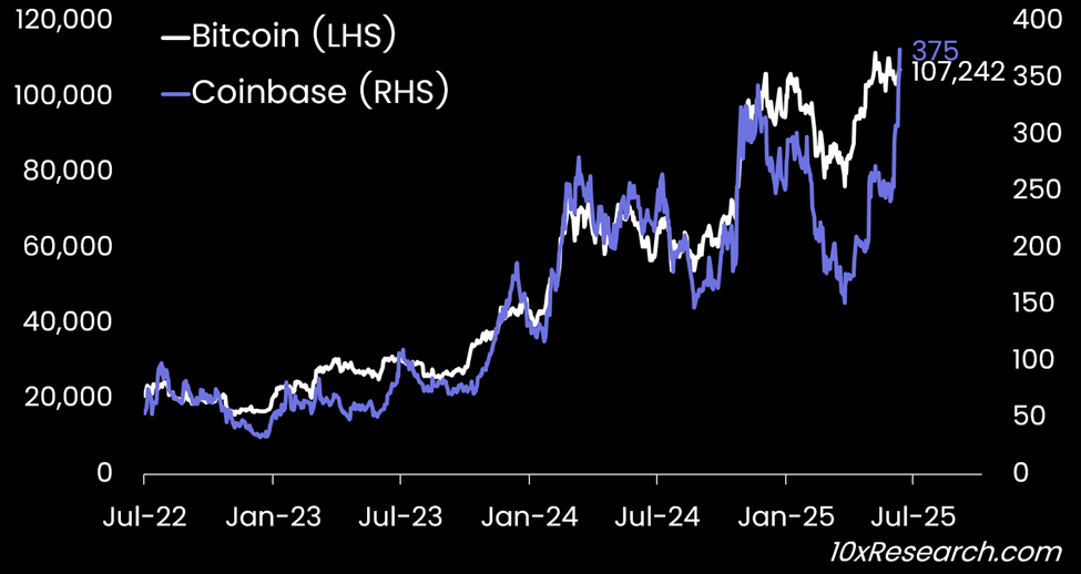 We’ve maintained a bullish view on Coinbase, with our valuation trigger aligning with its inclusion in the S&P 500, announced on May 19, when the stock was trading at $264. In our May 12 market report, we highlighted a significant divergence between Bitcoin and Coinbase’s share price, with COIN trading at $199 while Bitcoin stood at $102,971.