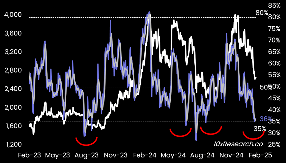 👇1-12) Ethereum’s Relative Strength Index (RSI) has dropped to 36%, a level where past corrections have slowed, even as Bitcoin remains in a bull market. Unlike Bitcoin’s parabolic rallies followed by extended consolidation periods, Ethereum has been more volatile this cycle, presenting high-risk, high-reward buying opportunities around key events—such as the ETF approval, trading launches, and major network upgrades.