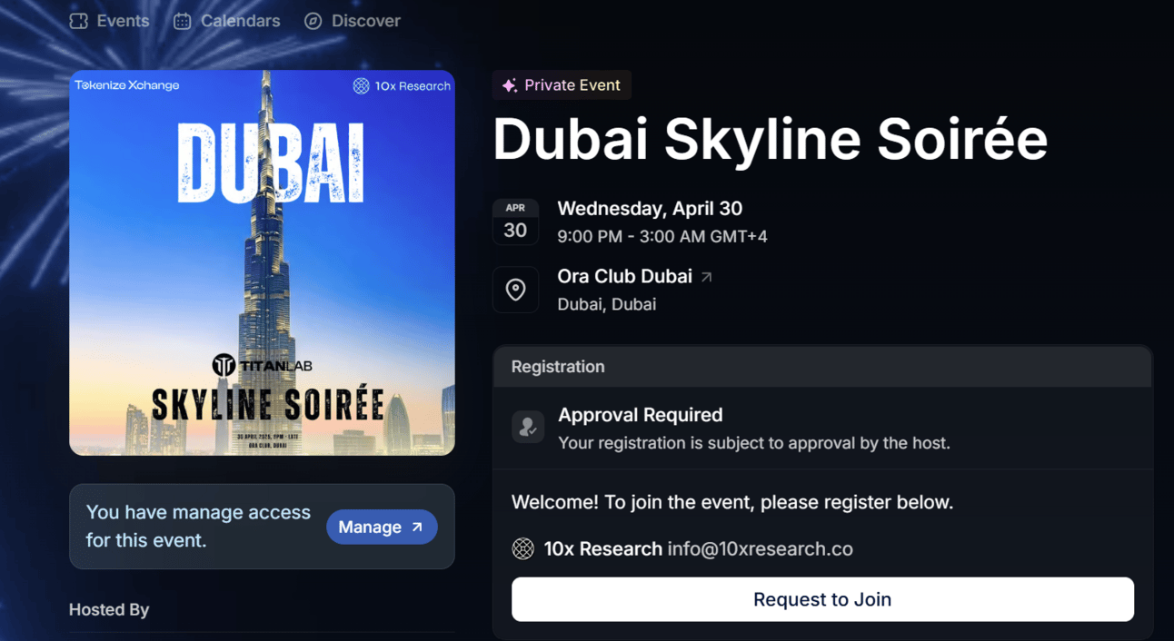 We are excited to co-host (together with Tokenize.Exchange) an exclusive event for 10x Research subscribers during Token 2049 Dubai. Join us for the Dubai Skyline Soirée at Ora Club Dubai on Wednesday, April 30, starting at 9 PM and going late into the night (link below).