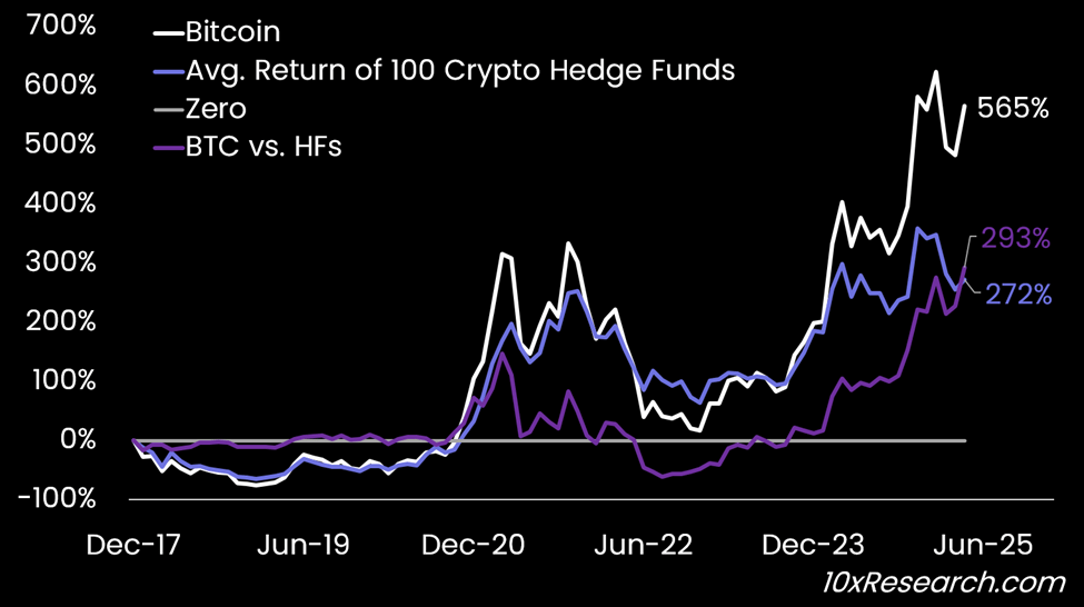 Crypto hedge funds are falling behind badly. While Bitcoin has surged over 565% since 2017, the average crypto hedge fund hasn’t even delivered half that, and the gap keeps growing. Altcoins have failed to spark, funding rate arbitrage is dead, and volatility strategies are breaking down. The game has changed, but most funds haven’t. What if the real edge lies in going tactical, turning directional, and thinking differently? We break down the data and the shifts reshaping crypto performance—and what smart money is starting to do about it.
