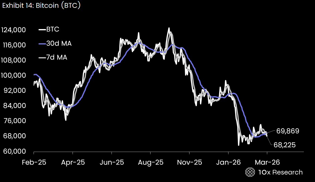 Bitcoin breaking below its 30-day moving average shifts the outlook to neutral-to-bearish amid geopolitical tensions and rising yields.
