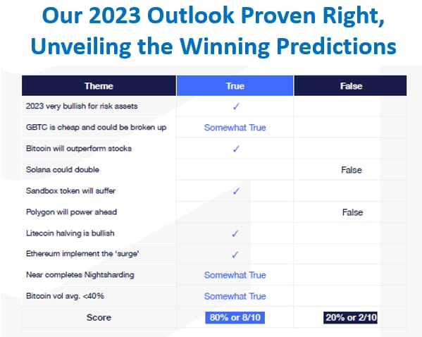 π 1)Β On December 2, 2022 we published a report, 'With a macro tailwind, Bitcoin might be at 29k in 2023'. Crypto revenues and transaction volumes were rebounding and we were very bullish on the macro outlook and expected lower inflation to drive Bitcoin prices higher.π 2)Β On December 9, 2022, we published βOutlook 2023: 18 Crypto Events to Look Forward toβ when Bitcoin was trading at 17,133, while most market commentators expected prices to drop even further to 15,000, we were bullish and remained relatively bullish since.
