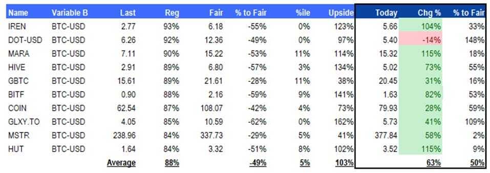 π 8)Β Microstrategyβs market cap is 100% based on Bitcoin and our model suggested +41% upside but now it indicates that the shares are reasonably priced (only 2% upside to be exact) after the stock rallied by +58% in three months.π 9)Β Similarly, the undervaluation of Grayscaleβs GBTC has now primarily closed to just 16% upside.π 10)Β What might still be attractive opportunities are Galaxy Digital with a potential +109% upside and Coinbase with +59% upside.βCrypto Titans: How trillions were made and billions lost in the cryptocurrency markets". Available on Amazon:Β https://amzn.to/3WJMuCQ (FTX, Binance, Bitmex, Three Arrows, Terra, etc.-> endorsed by Wintermute, Coinbase, Draper, Animoca)