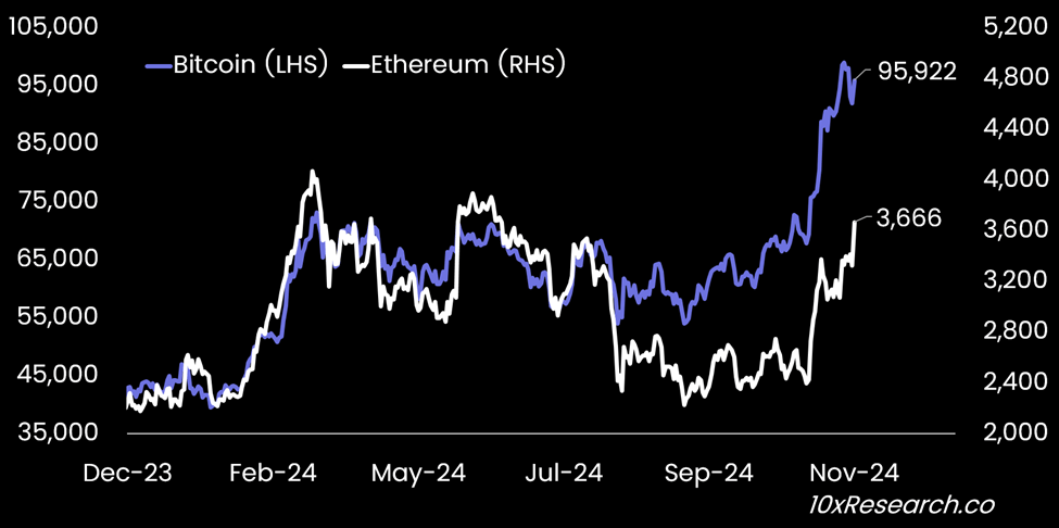 Bitcoin (LHS) vs. Ethereum (RHS)