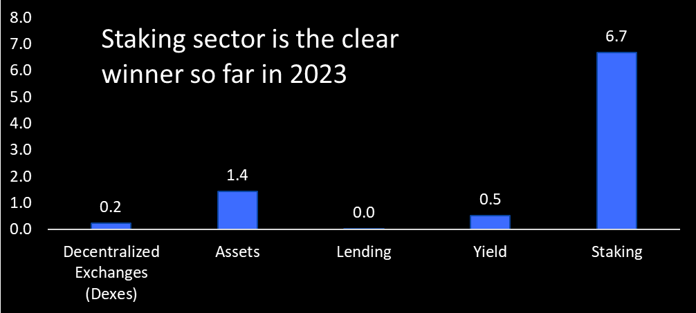 π 1)Β If you think the U.S. has a long and prosperous future, you should lend the U.S. government at 3.53% per annum for the next ten years. This has become a hot topic in light of the U.S. debt ceiling.π 2)Β Still, with the introduction of A.I. and other deflationary forces, investors might make some money not only on the annual interest that the U.S. government pays but also on the revaluation of the bond principal as interest will decline, and bond prices rise.π 3)Β This strategy worked in the 2010s as quantitative easing provided enough capital to go around and as people needed to figure out what to do with all that money that eventually was moved into low-yielding sovereign bonds.π 4)Β This sounds as exciting as staking Ethereum where a validator is responsible for storing data, processing transactions, and adding new blocks to the blockchain. The question now arises if people are staking ETH because they do not know what else to do in βdefiβ? Or maybe there is nothing else to do.π 5)Β Staking is nothing else than storing your capital and making some 5% yield on your ETH. This is a far cry from the 10x returns people talked about a year or two ago or from the wild-west days of yield farming.π 6)Β The crypto metric TVL β total value locked β measures the total value of digital assets locked or staked in DeFi. This year, TVL has increased by $8.8bn to $68bn β 75% of the TVL increase associated with the staking sector. Lending, Yield, and Dexes have seen near zero increases, while WBTC dominates the Assets sector. WBTC is wrapped Bitcoin, a token that mirrors the value of Bitcoins.