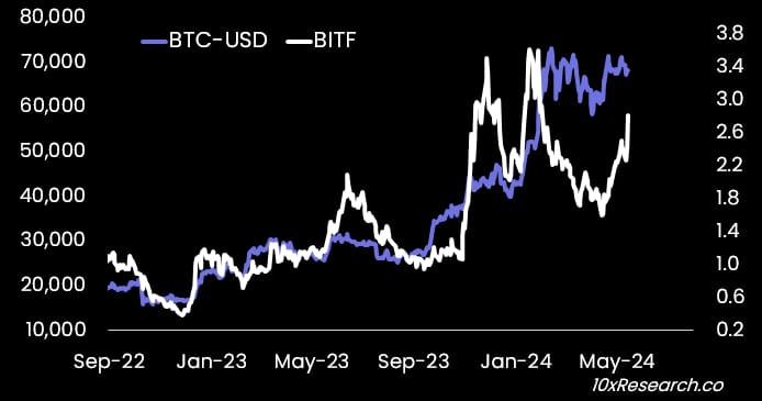 Bitcoin (purple) vs. Bitfarms (white) - the gap is closing.