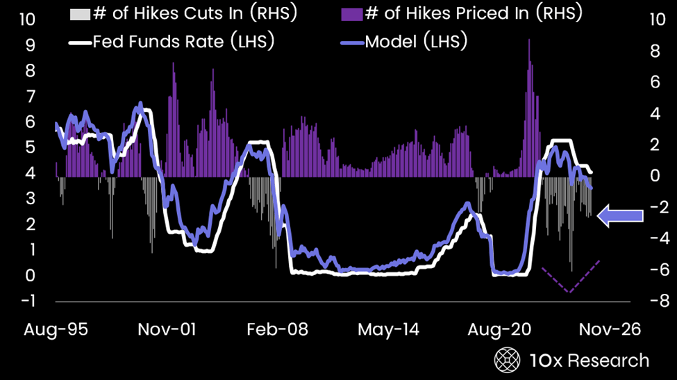 U.S. Fed Funds rate (LHS) vs. number of rate changed priced in (RHS)