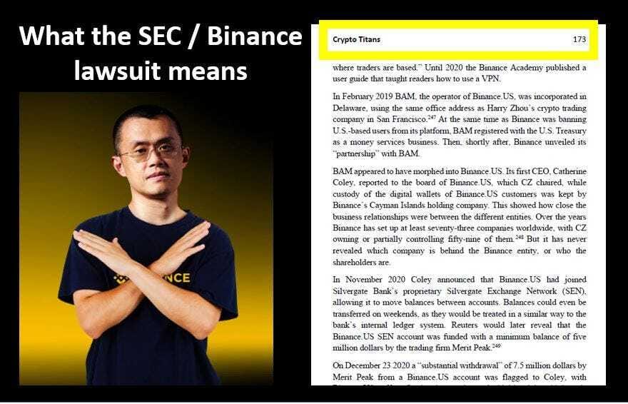 π 4)Β Everybody can read pages 166-179 in the βCrypto Titansβ book and judge the likely outcome for themselves.π 5)Β The crypto industry will be fundamentally different as Binance has already taken various steps to prepare for such an event. Remember when Binance moved $1bn of BNB tokens into BTC and ETH a few months ago, remember when Binance stopped zero-fee for BTC crosses and volumes started to dry up β leading to Jane Street and Jump Crypto stepping back from market-making activities?π 6)Β The SEC lawsuit is BIG and claims that Binance has earned at least $11.6bn in revenue illegally. But CZ as βa control personβ, is liable, the statement reads. This could lead to DoJ implications for the firmβs founder.π 7)Β Like FTX and Sam Bankman-Fried, the SEC also alleges that Binance and CZ commingled customer funds & sent them to CZβs trading entity Merit Peak Limited. That entity was also used for other actions in combination with the Key Vision entity in Seychelles.π 8)Β BAM trading later morphed into Binance.US lost several CEOs in short order, and the entityβs first CEO Coley already hired a former CFTC enforcement director & is now a partner at law firm Sullivan & Cromwell as her attorney in April 2021. It appears that she has testified and has fully cooperated with the SEC.π 9)Β While this lawsuit is unfortunate, nobody should be surprised, & the outcome appears quite apparentβ¦π 10)Β Everybody must now watch the value of BNB tokens, assets on the Binance exchange and the perp discount for BNB tokens. The industry will be very different in a year. Trading volumes will likely drop further & pressure market makersβ revenue projections. Crypto in the US will continue to go through a nuclear winter.π 11)Β The ONLY viable option for crypto firms might be Hong Kong, where the regulator appears willing to offer a licensed level playing field, risk-seeking multi-billion dollar family office investors keen to provide crypto entrepreneurs funding, & the greater Bay Area ecosystem provides access to talent.π 12)Β If Hong Kong is indeed the first step for China to move back into crypto, then crypto will explode in Asia & the crypto industry can move on.