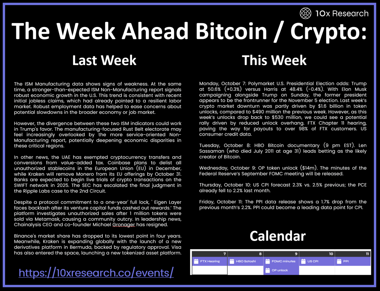 Monday, October 7: Polymarket U.S. Presidential Election odds: Trump at 50.6% (+0.3%) versus Harris at 48.4% (-0.4%). With Elon Musk campaigning alongside Trump on Sunday, the former president appears to be the frontrunner for the November 5 election. Last week’s crypto market downturn was partly driven by $1.6 billion in token unlocks, compared to $490 million the previous week. However, as this week’s unlocks drop back to $530 million, we could see a potential rally driven by reduced unlock overhang. FTX Chapter 11 hearing, paving the way for payouts to over 98% of FTX customers. US consumer credit data.
