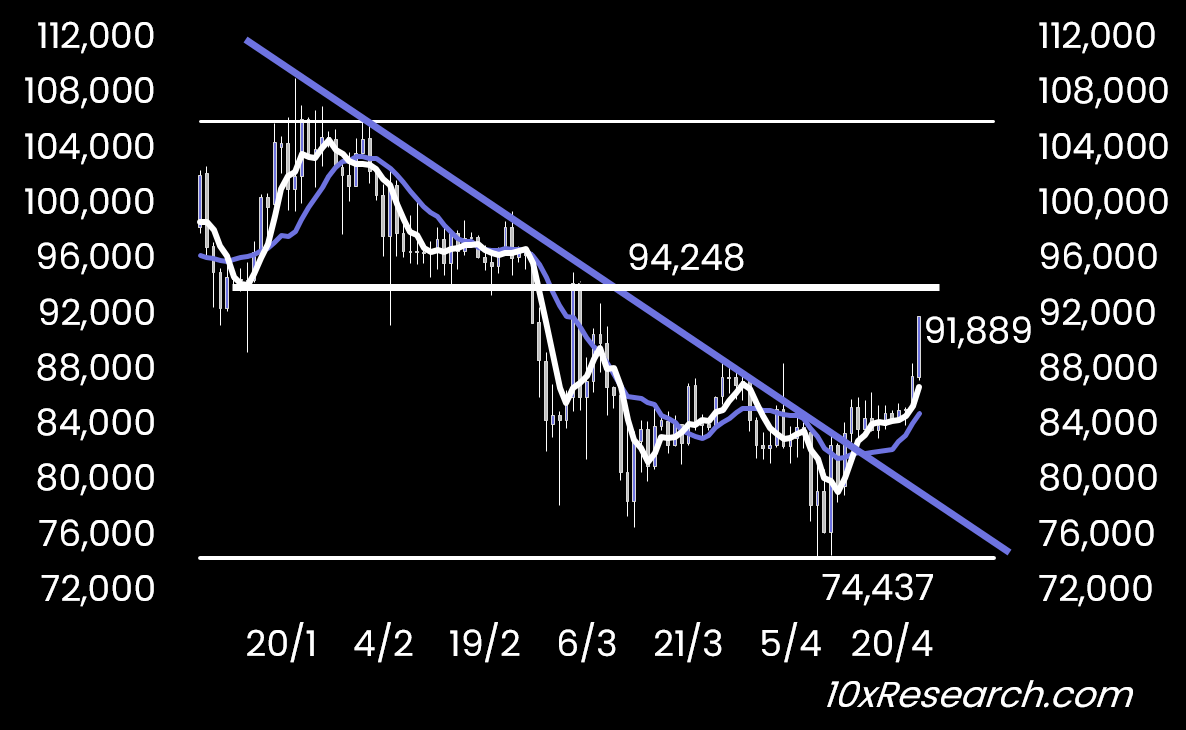 👇4-10) Bitcoin has rallied over 10% since we adopted a more constructive view on April 12 (here), highlighting bullish technical indicators and a more favorable risk/reward setup on the long side. Our trend model also turned positive, mirroring CTA-style systems, which helped anticipate the wave of systematic buying that followed (here).