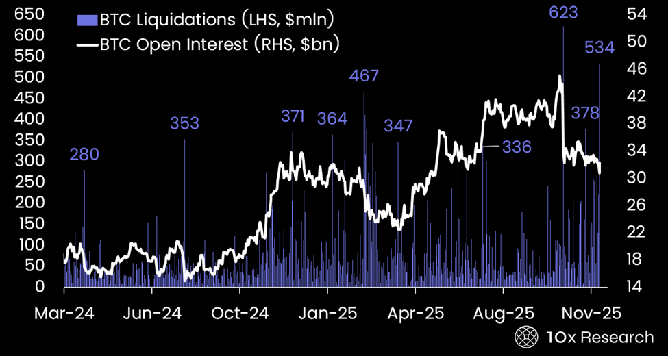 BTC Liquidations (LHS, $ millions) vs. BTC Open Interest (RHS, $ billions)