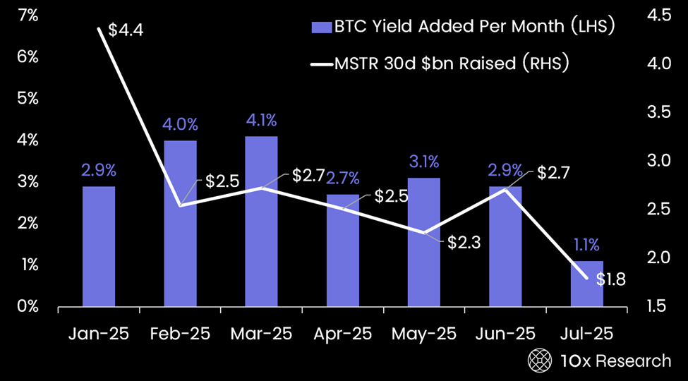 MicroStrategy Monthly Bitcoin Yield (LHS) vs. MSTR capital raising (RHS)